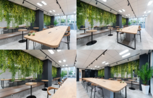 内観については、落ち着いた雰囲気の中にも洗練された印象を与える空間となっています。ガラス張りの設計により、開放感があり、自然光も十分に取り入れられています。この特徴は、会議や商談の際に快適な環境を提供し、クリエイティブな発想を促進する効果があるでしょう。