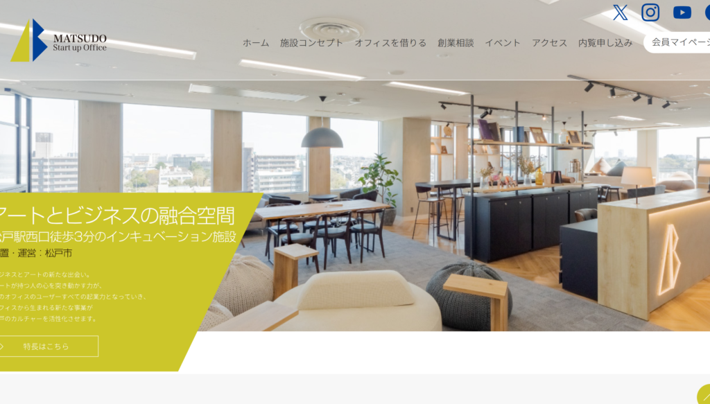 松戸スタートアップオフィスは、松戸市が運営する起業支援に特化したバーチャルオフィスです。「Art with Business」をテーマに、オフィス内の壁面や家具に随所にアートを散りばめた創造的な空間を提供しています。インキュベーションマネージャーによる無料の起業支援相談が利用可能で、Katanaオフィス渋谷やKatanaオフィス船橋など、全国7つの提携レンタルオフィスとの相互利用が可能です。また、クラウドオフィスプランでは時間単位(330円/時間)での利用も可能で、コストを最小限に抑えることができます。
