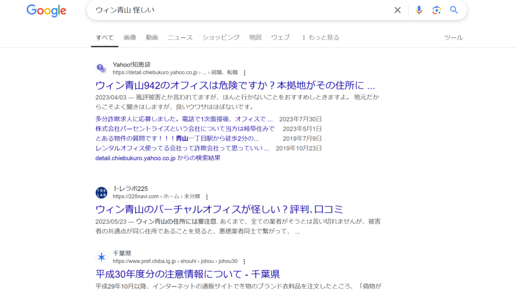 例えば、↑の画像のように、あるバーチャルオフィスの拠点のマンション名を検索をするとネガティブな情報が出てきます。